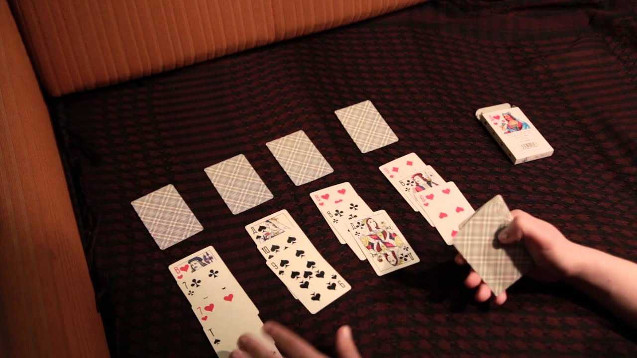 - Затем начинайте последовательно раскладывать карты из колоды под каждого из четырех королей. Всего получится четыре стопки по восемь карт.