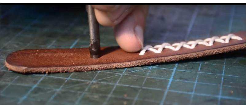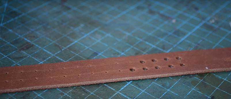 - Отступив от края, пробить отверстия с обеих сторон браслета. Установить в них заклепки.
