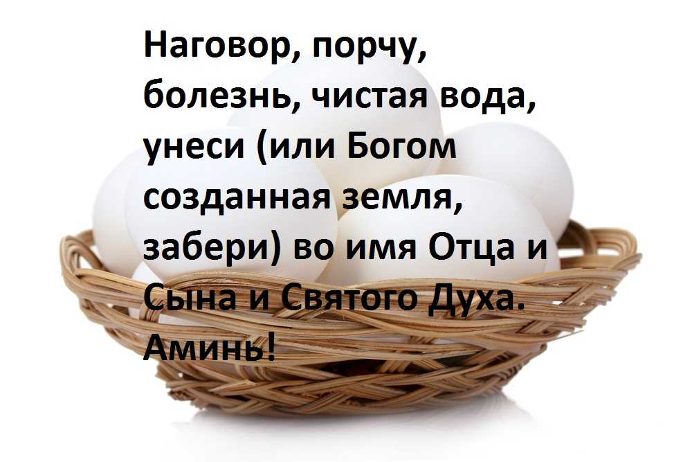«По Господа нашего Иисуса Христа попущению, изыди вся порча из тела, костей, кожи, крови, мышц и волос раба божия (имя) в эти яйца, как Господь бесов в свиное стадо изгонял. Поди вся скверна из дома прочь».