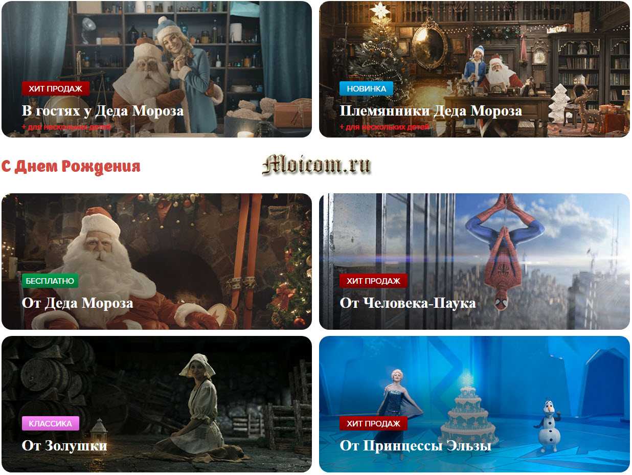 Есть 4 поздравления с днем рождения: от Деда Мороза, Человека Паука, Золушки и Принцессы Эльзы. Также Деда Мороз может поздравить вашего ребенка с 1 сентября на день знаний. До 13 декабря действуют скидки от 459 рублей за одно поздравление, после будет дороже от 549 р.