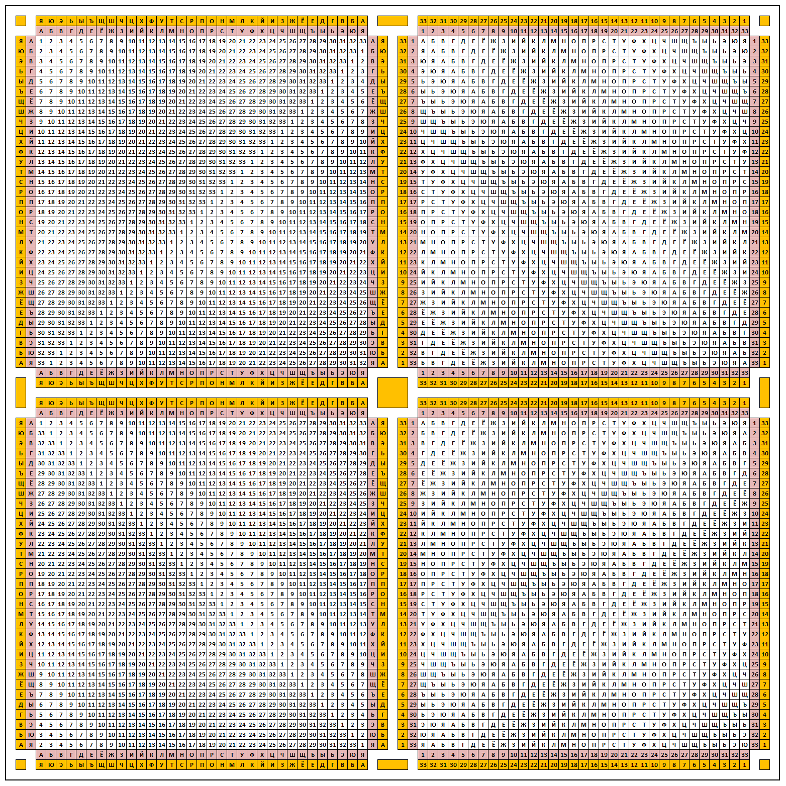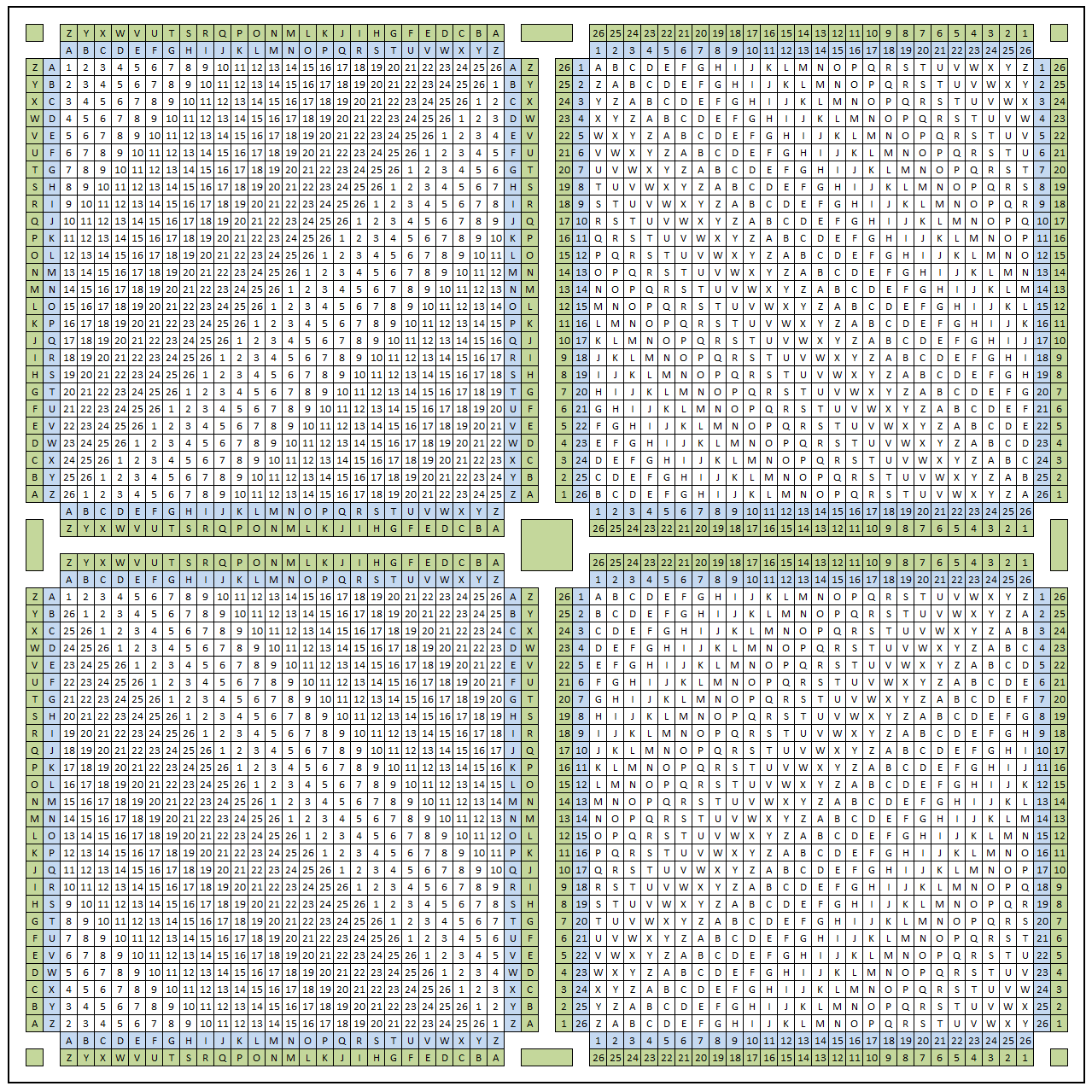 Легко заметить, что строки этой таблицы — это ROT-шифры с последовательно увеличивающимся сдвигом.