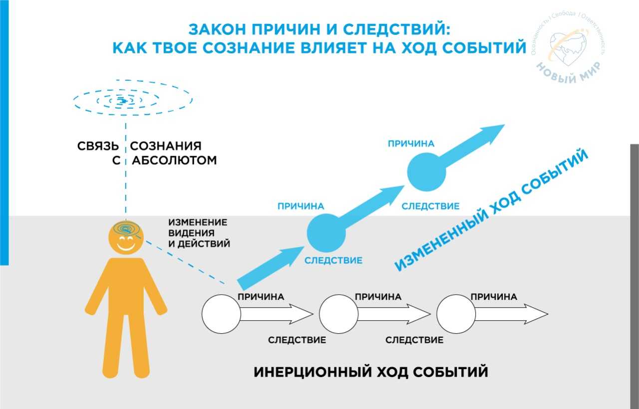 При этом, сознание неразрывно связано с Абсолютом, оно наиболее близко к его изначальной природе. Поэтому состояние сознания не может быть заранее предопределено. Хотя именно оно и создает подлинную первопричину событий. В результате, изменение твоего сознания может откорректировать причинно-следственные связи, действующие в твоей жизни.