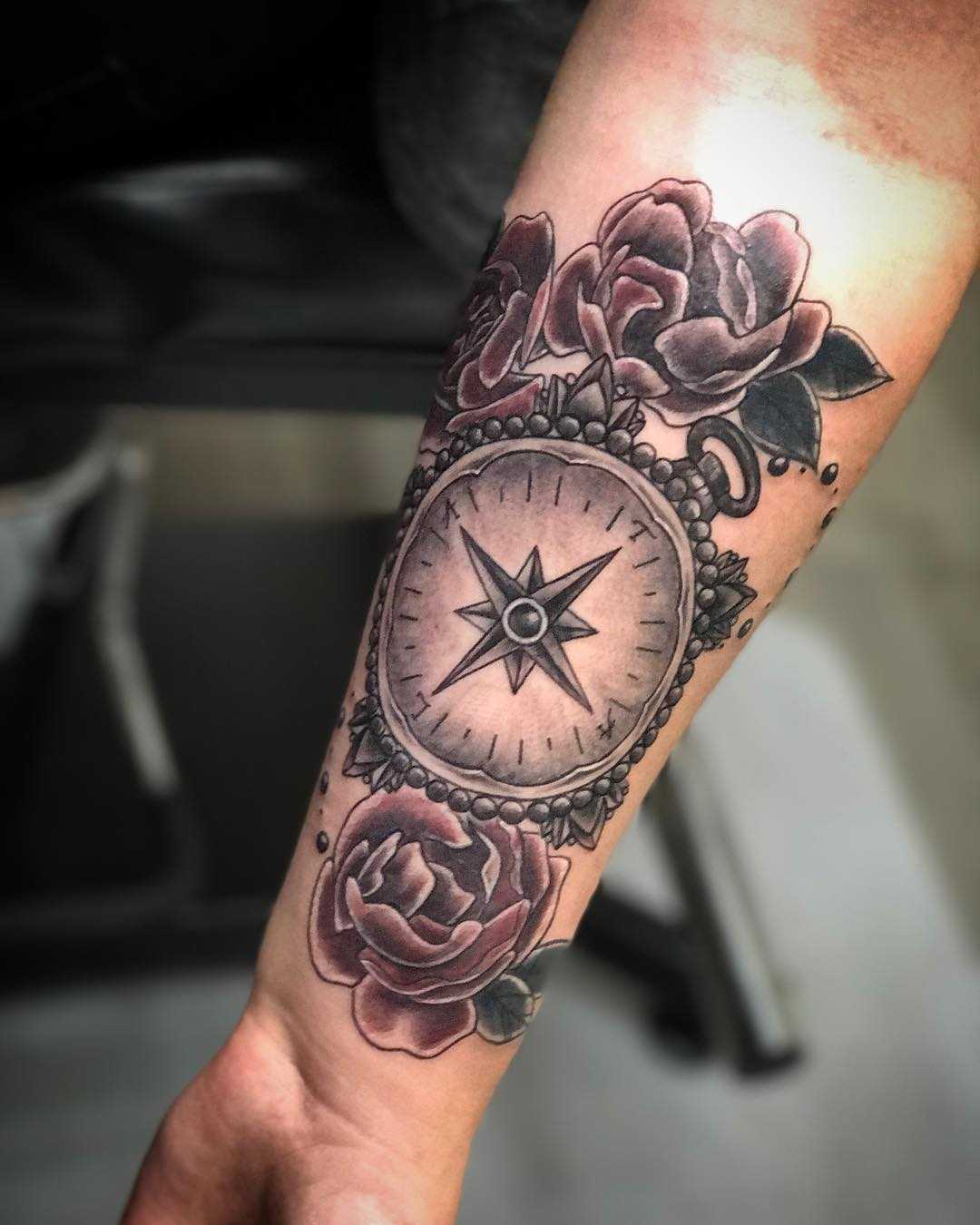 Значение татуировки компас, зависит не только в каком стиле оно выполнено, но и от места нанесения. Достаточно часто рисунок встречается на плече или предплечье. Зачастую компас на этой части тела наносят уверенные в себе мужчины. Это хорошее расположение нательного рисунка для офисных работников, ведь скрыть татуировку на руке достаточно просто. Татуировку на плече или предплечье можно с легкостью сочетать с другими элементами. Например, компас в сочетании с розой, у путешественника обозначает искреннюю любовь и преданность к своей второй половинке. Компас с флористическими мотивами обозначает доброту и любовь к природе.